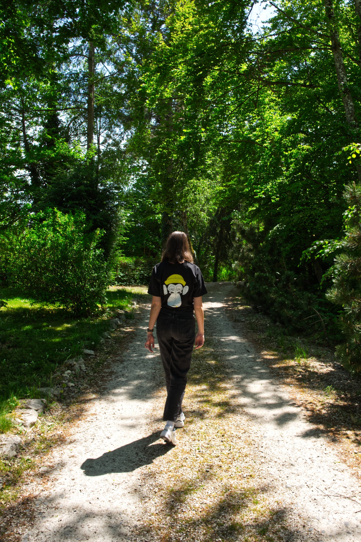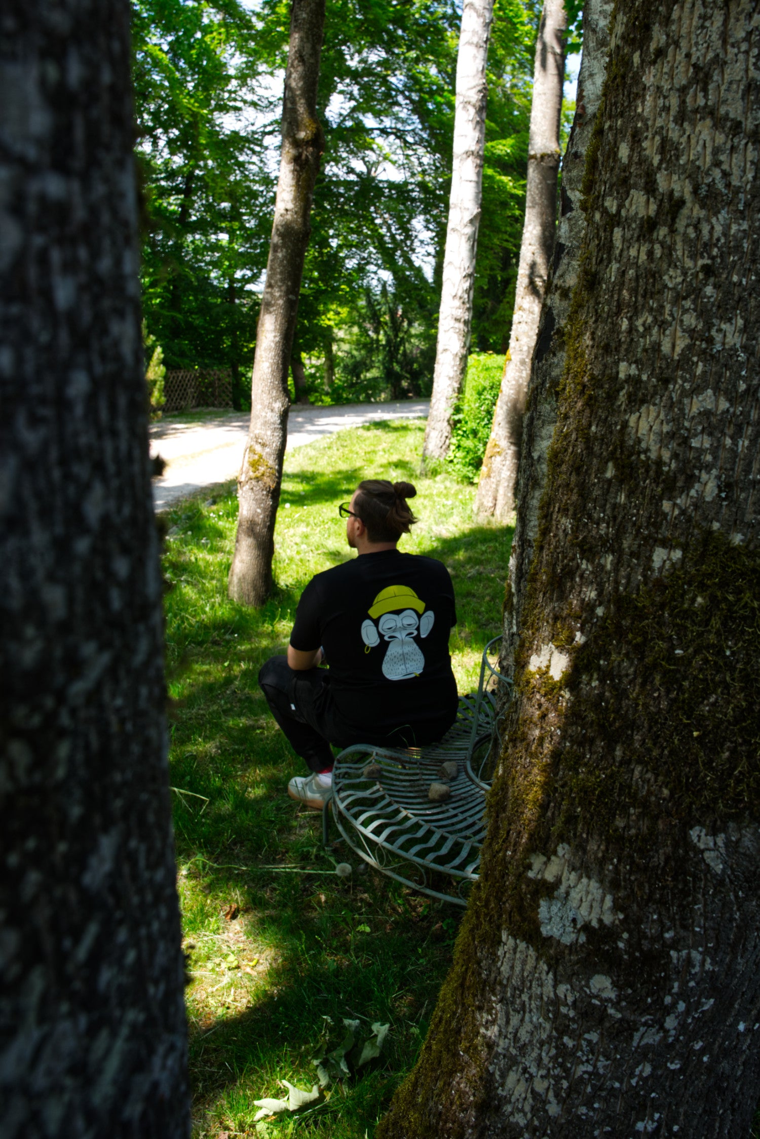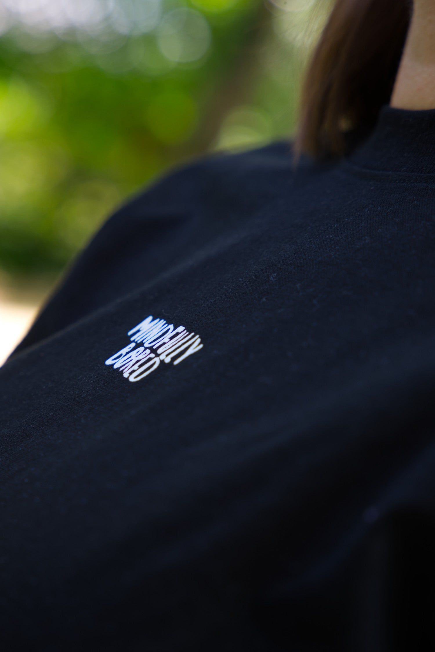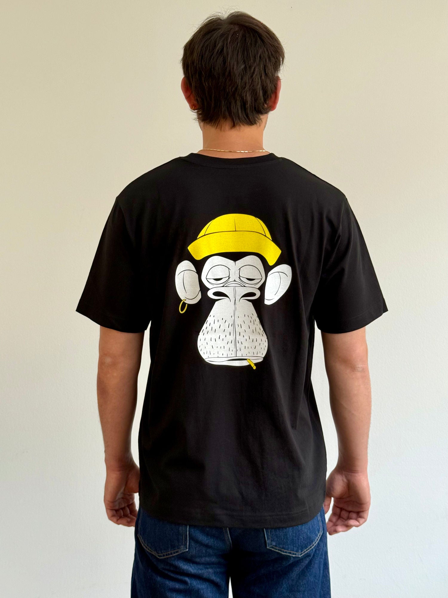 On the front, the Mindfully Bored logo is centered at chest height, and on the back, the minimalist "Bored Ape Loki" is screen printed in two colors.